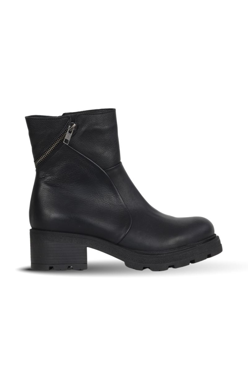 Deri dış yüzeyiyle şıklığı, 5 cm topuğu ve thermo tabanı ile konforu buluşturan bu dar kalıp kadın bot, günlük stilinize zarif bir dokunuş katar.